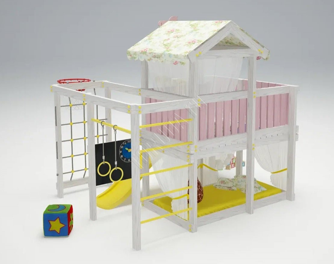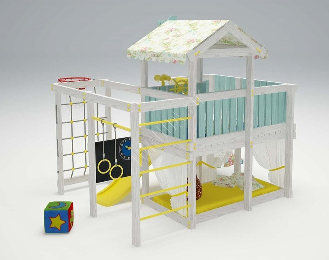 - Основа модульной конструкции – домик. Высота от поверхности пола до платформы составляет 90 см. Взобраться туда непросто. Сделать это можно только по мини-скалодрому. Для облегчения задачи добавили удобный канат. Подъём станет хорошей тренировкой для мышц мальчиков и девочек. Слезать со второго этажа легче. Ребёнок может скатиться по горке. Её длина 175 см.
