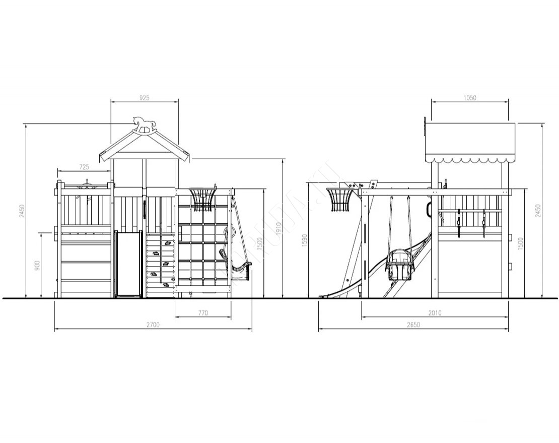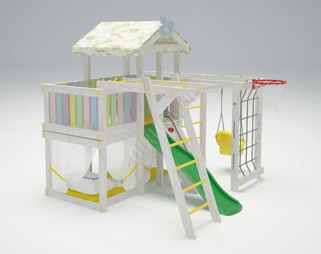 Чтобы разнообразить развлечения, предусмотрены 2 игровые зоны наверху и внизу, домик под крышей и балкон. И полный комплект спортивного инвентаря, включающий шведскую стенку, сетку, детский турник, гимнастические кольца, скалодром.