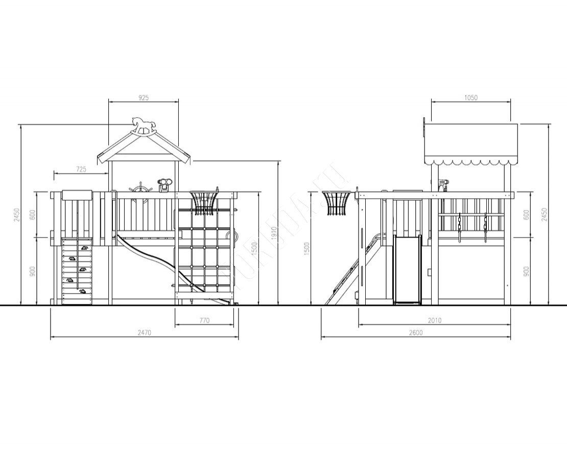 Детская площадка представляет собой компактный и многофункциональный комплекс, который точно понравится каждому ребенку. Он состоит из двух игровых зон - на верхнем и нижнем этажах. А также большого балкона, пробраться на который можно преодолев препятствие – скалодром с канатом. В комплектацию входят меловая доска для рисования, настоящий бинокль и морской штурваль.
