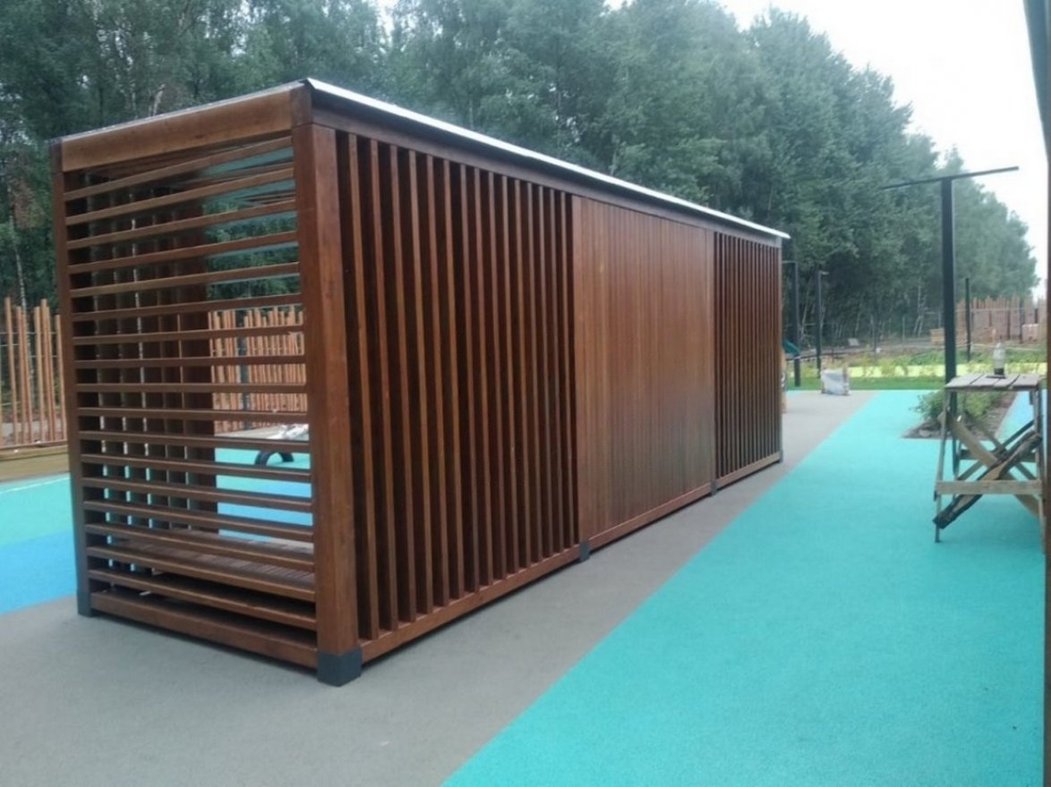 Обшивка: Брус из хвойных пород древесины. Покрытие - атмосферостойкая лессирующая акриловая пропитка с лаком.