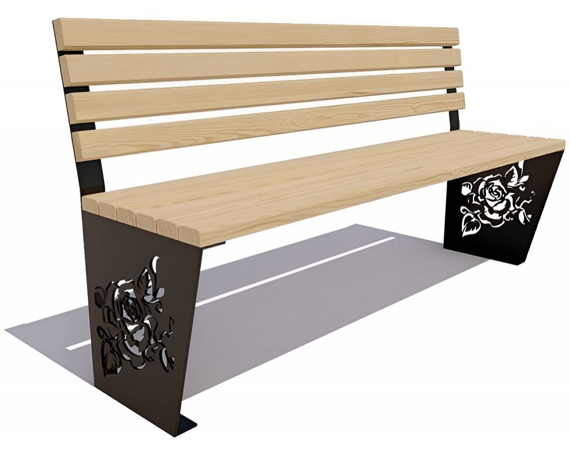 Красивая скамейка «Роза» без подлокотников — идеальное украшение дачного участка или парка и сквера. Каркас ее сделан из листовой стали, боковины украшены рисунком, выполненным лазером, в виде распустившейся розы. Сидения из ангарской сосны или лиственницы окрашиваются в 5 цветов по каталогу RAL.