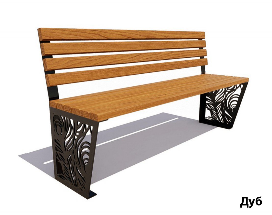 Стальные боковины скамейки «Павлин» без подлокотников выполнены в виде перьев павлина, что придает им необычный вид.