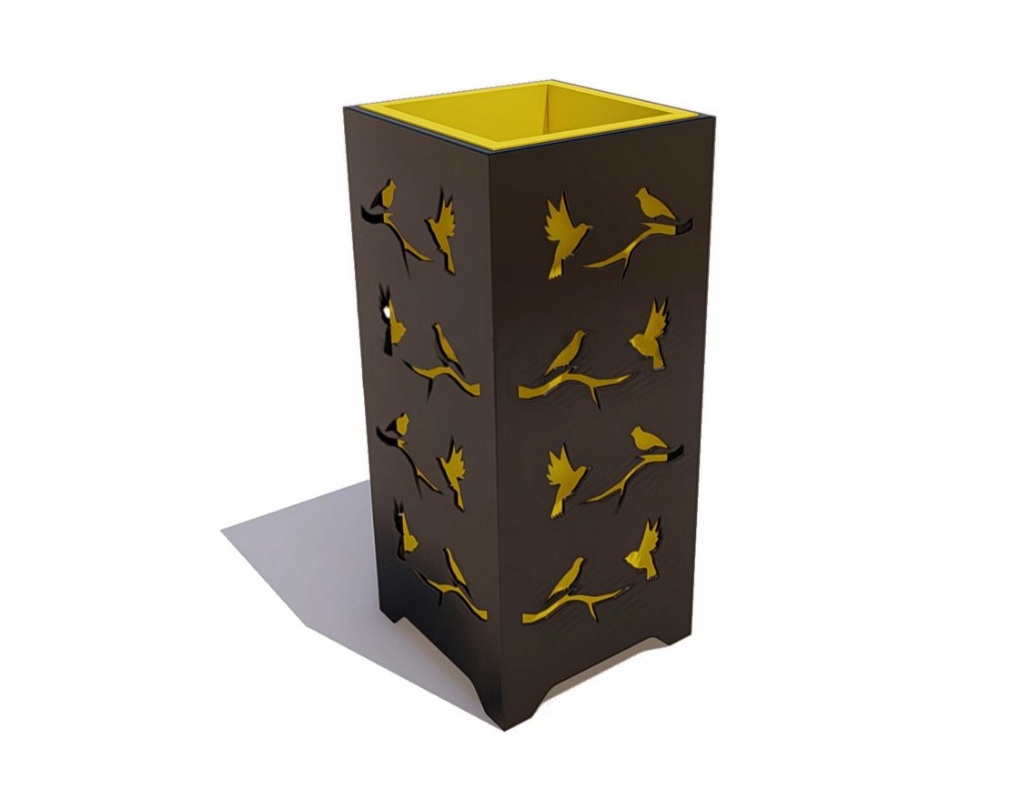 Украшение уличной урны «Встреча» – вырезанные в каркасе лазером птицы на ветках. Каркас и контейнер могут окрашиваться в разные цвета, по желанию заказчика. Контейнер – съёмный, выполнен из оцинкованной стали.