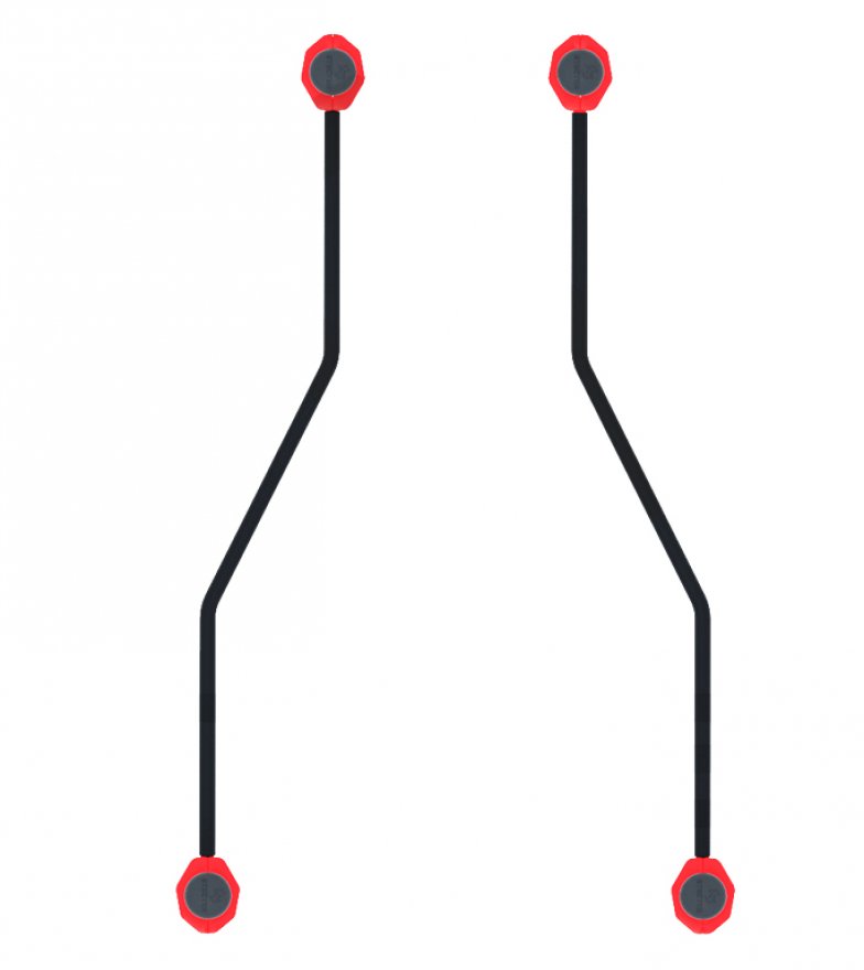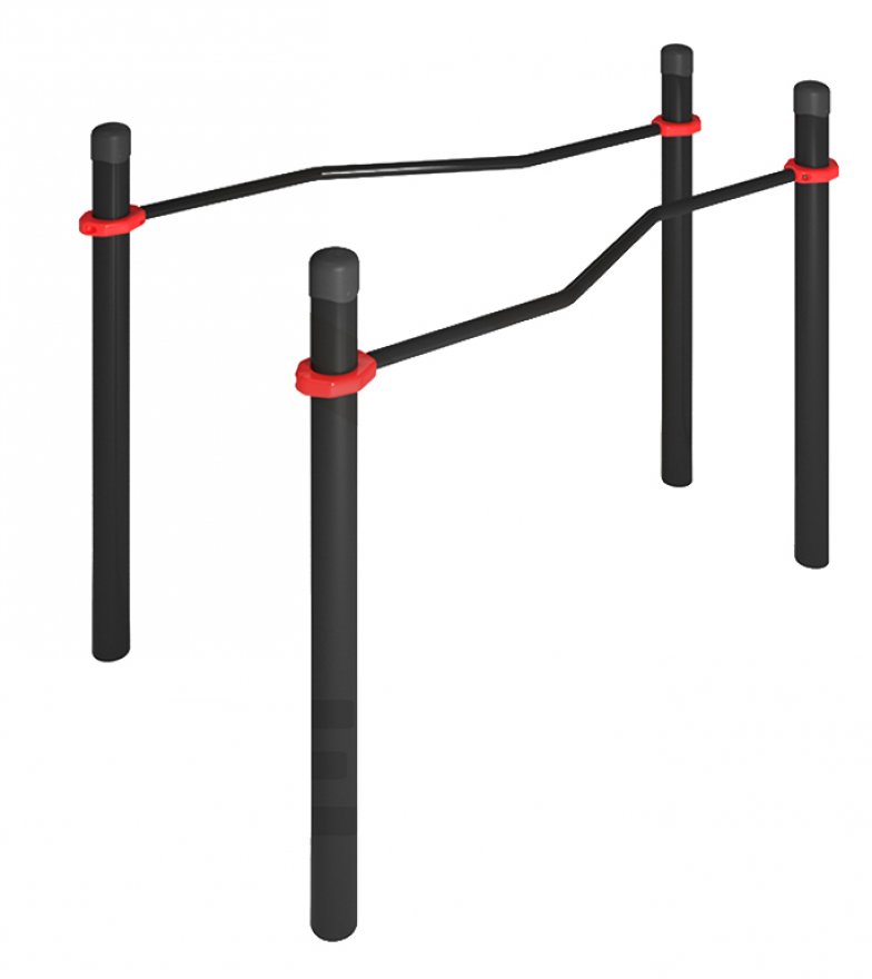 Комплекс состоит из четырех опорных столбов высотой 1230 мм и двух зигзагообразно изогнутых жердей длиной 1790 мм. Расстояние между центрами опорных столбов брусьев: 608 мм - с одной стороны и 1008 мм - с другой стороны. Жерди крепятся к опорным столбам при помощи хомутов на высоте 1000 мм от поверхности основания. Длина комплекса не более 2010 мм.