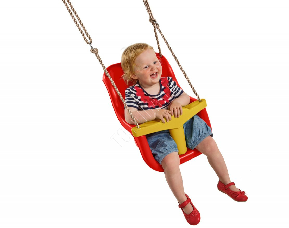 Качели оснащены снимающимся разделителем, который препятствует выпадению ребёнка, и ремнём безопасности.