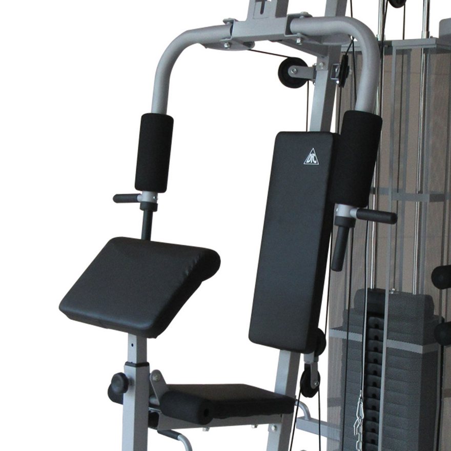 - Многофункциональный тренажер с встроенным весовым стеком. Позволяет выполнять комплекс упражнений на различные группы мышц. Дополнительно тренажер имеет брусья для отжимания и скамью для пресса с гантелями по 1,5 кг. с регулировкой по углу наклона.