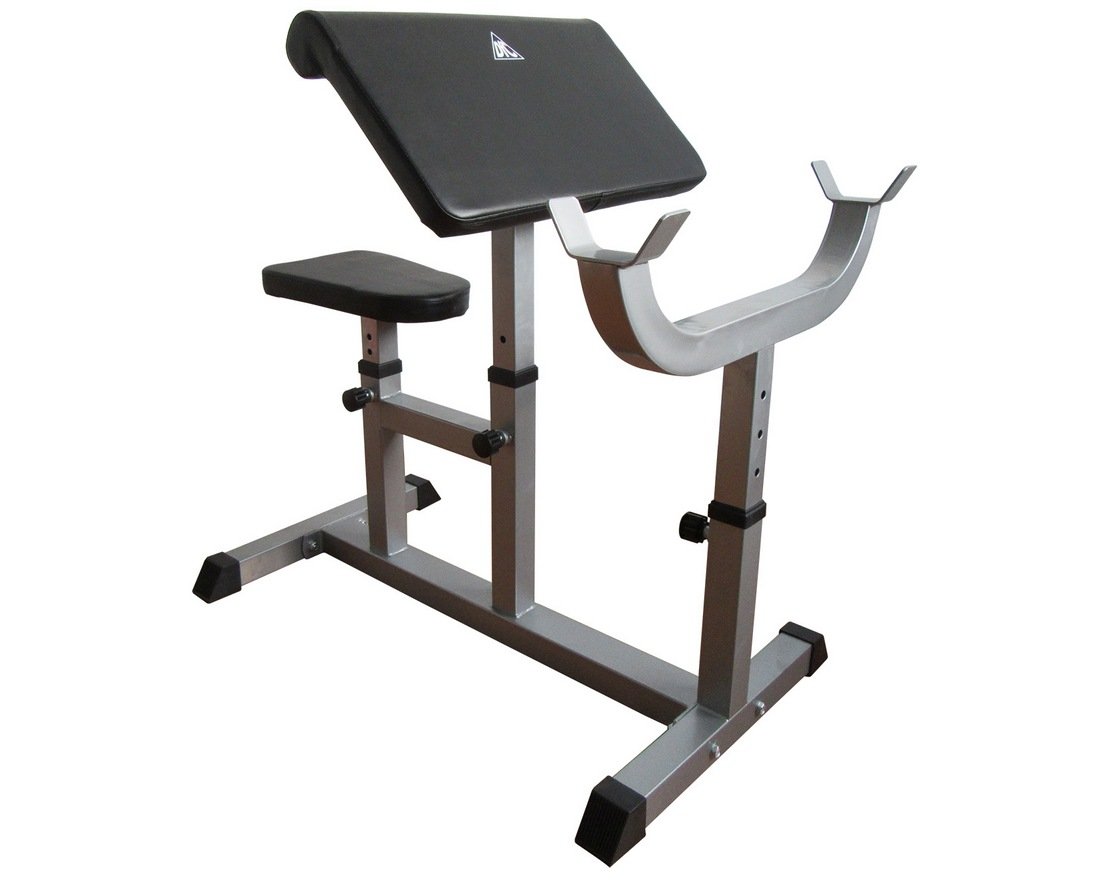 - Сиденье, парта для бицепса и стойки под штангу регулируются по высоте.