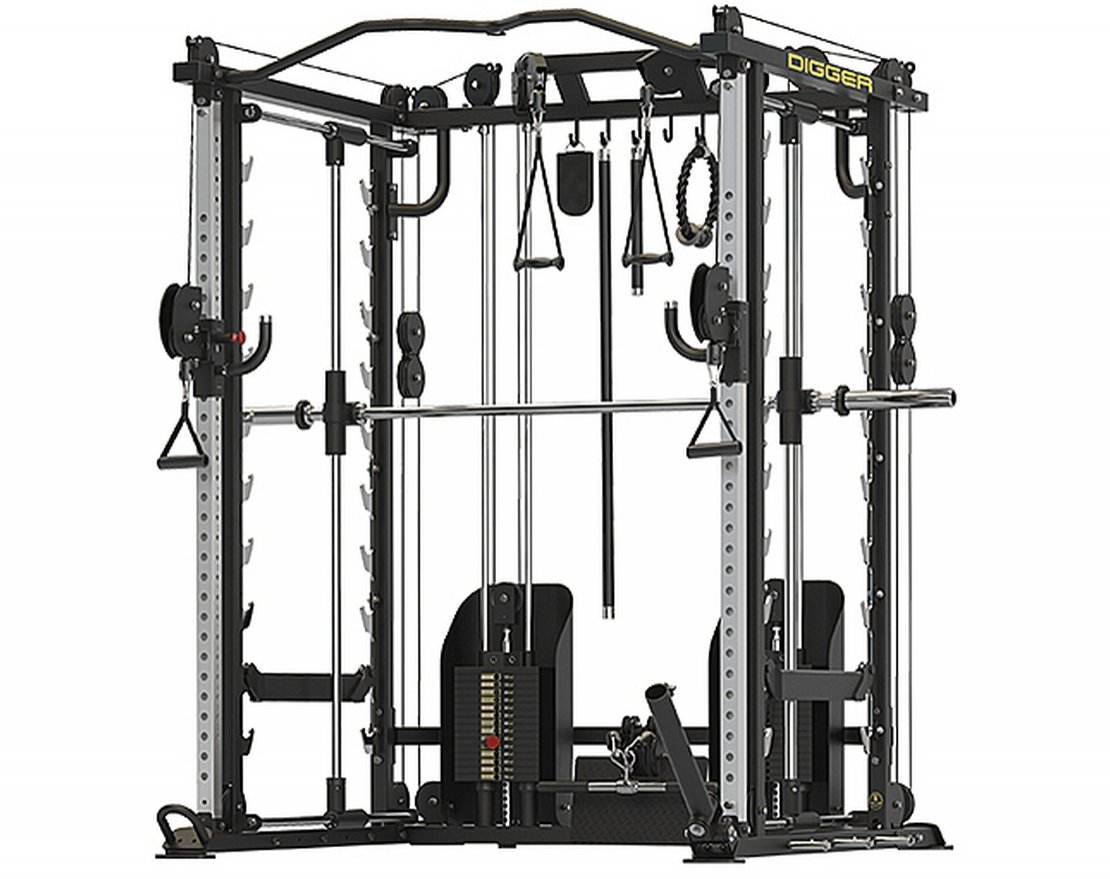 Мультикомплекс Hasttings Digger HD009-7 — это многофункциональная станция для комплексных тренировок, которая сочетает в себе: 3D Машину Смита, двойную регулируемую тягу, силовую раму, нижнюю тягу, два независимых блока внутри рамы для верхней тяги, тренажер Landmine, крепление для каната, блочные ручки и манжеты для различных упражнений в комплекте.