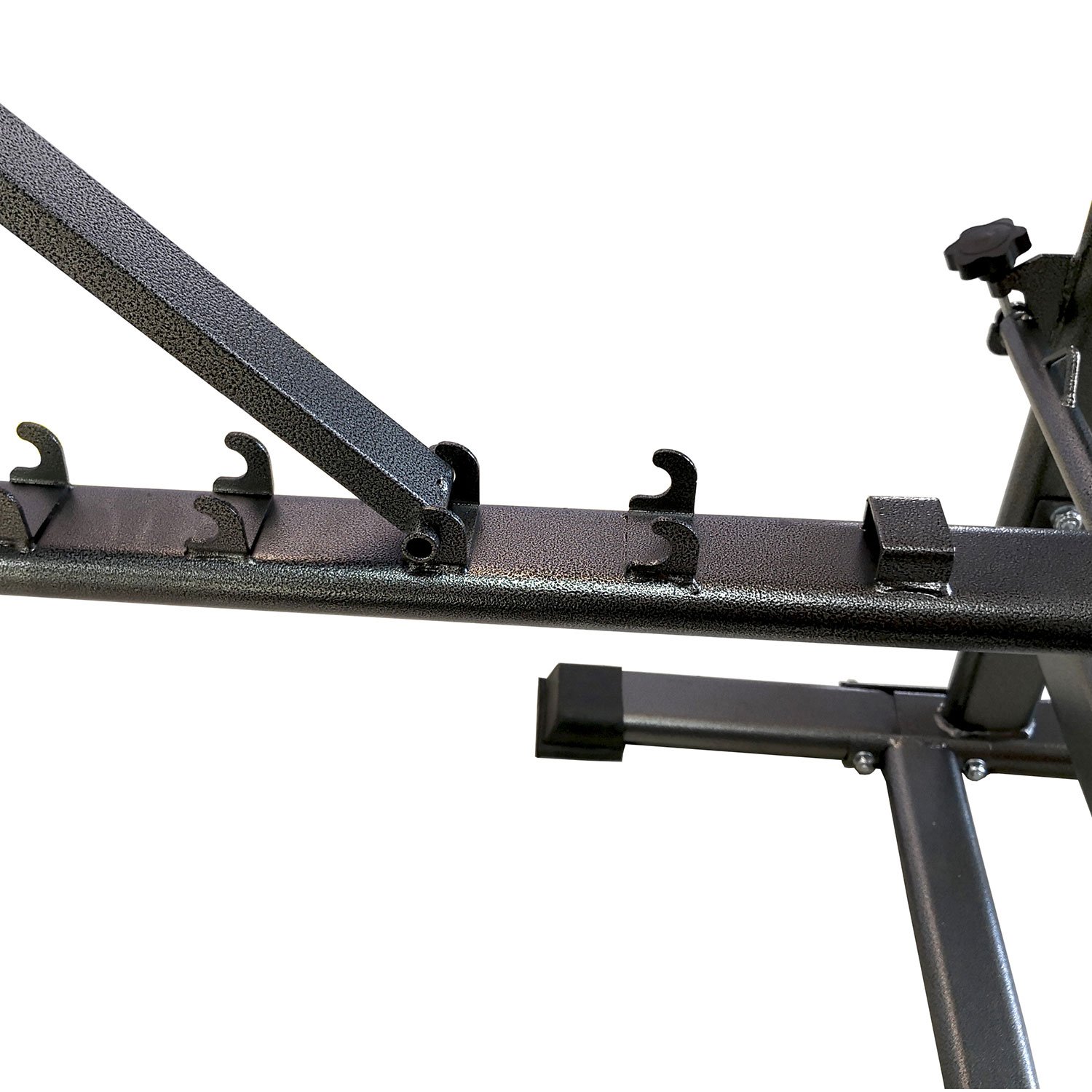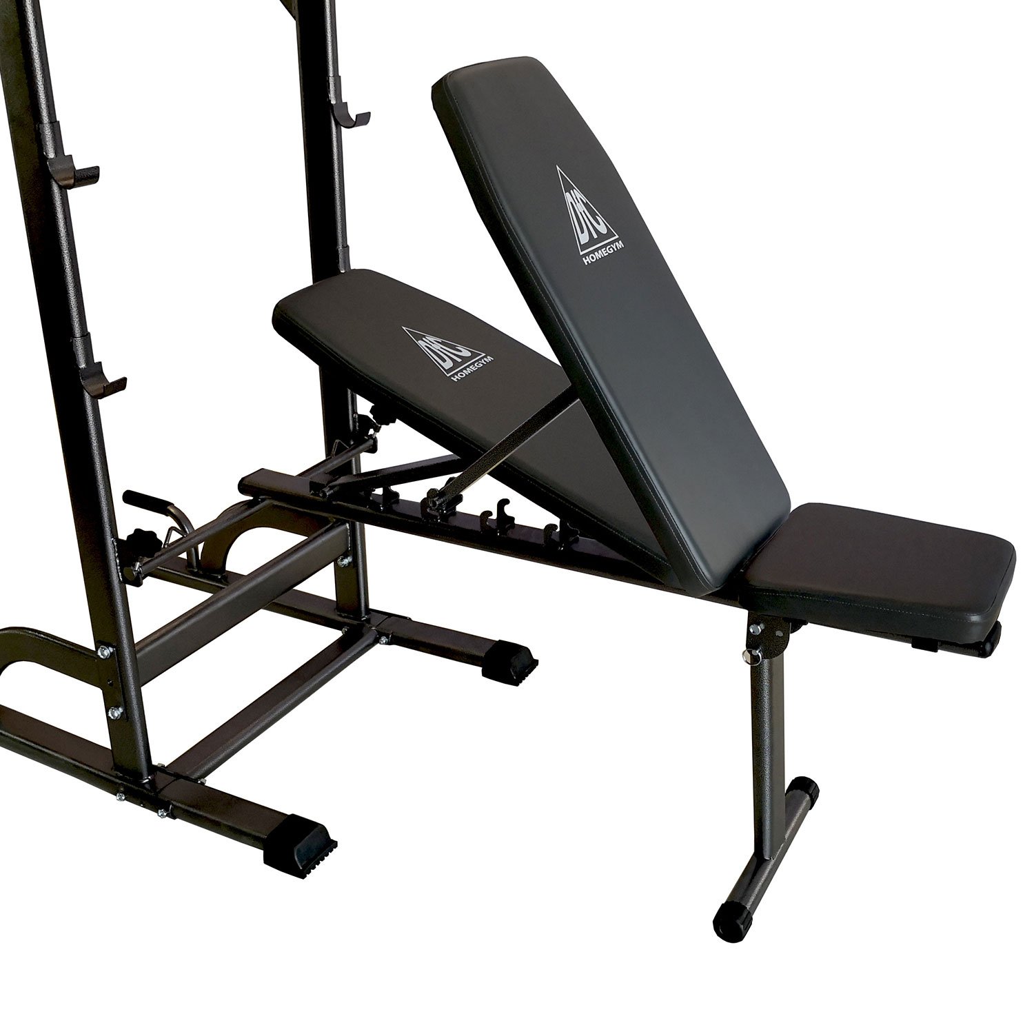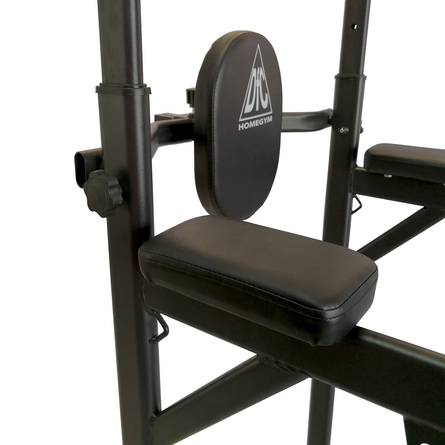 В комплекте идет универсальная скамья с регулировкой угла наклона спинки. С помощью парных крючков на раме турника возможно установить скамью под разным углом для выполнения различных упражнений.