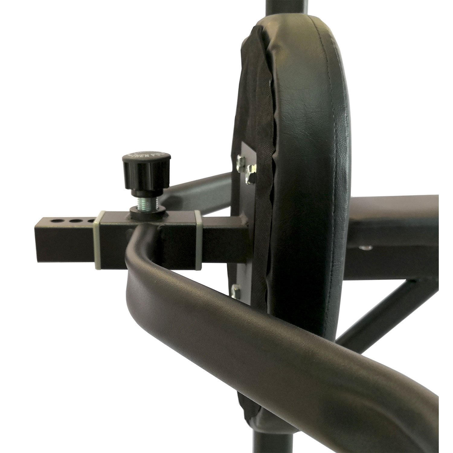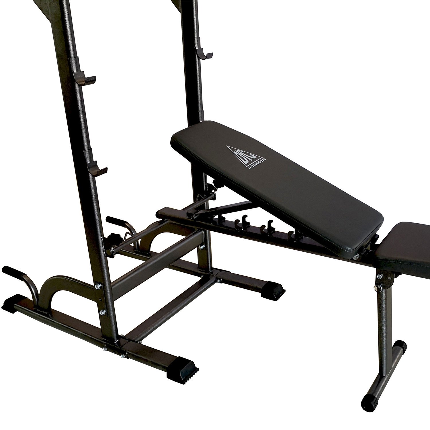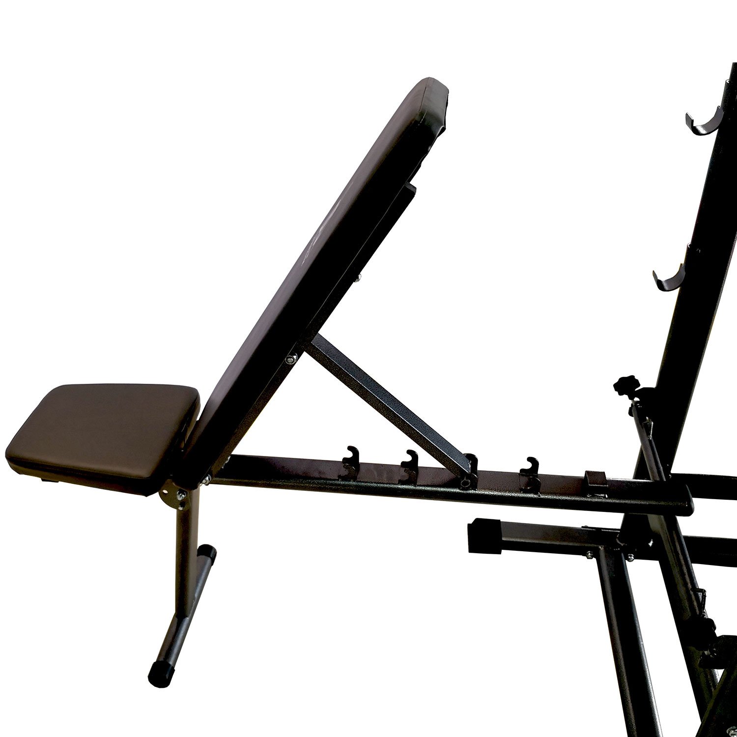 В комплекте идет универсальная скамья с регулировкой угла наклона спинки. С помощью парных крючков на раме турника возможно установить скамью под разным углом для выполнения различных упражнений.