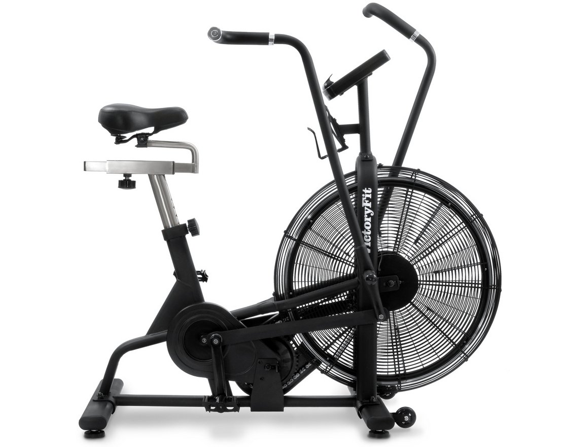 Эйрбайк VictoryFit VF-AirBike GT. Нагрузка обеспечивается за счет воздушного сопротивления. Предусмотрена регулировка сидения, как по высоте, так и в горизонтальной плоскости, под любой рост пользователя. На мониторе отображается информация о затраченных калориях, пройденной дистанции, времени, скорости. Занимающийся может использовать только силу ног, вращая педали или силу рук. Для более интенсивной кардио-тренировки можно совмещать движения рук и ног. Педали вращаются и в обратном направлении, для того, чтобы задействовать различные группы мышц.